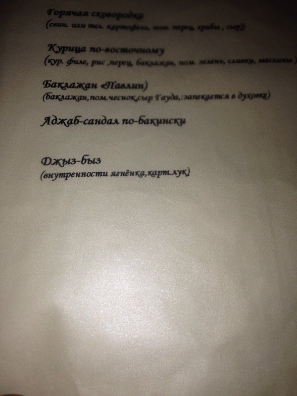 В нашем меню представлены блюда нескольких видов кухонь: кавказской (а именно азербайджанской, грузинской), европейской, из которых самой популярной, пожалуй, является европейская. Наши повара знают, как правильно сохранить истинный вкус главных составляющих в блюде - овощных или мясных, лишь аккуратно дополняя его вкусом специй.